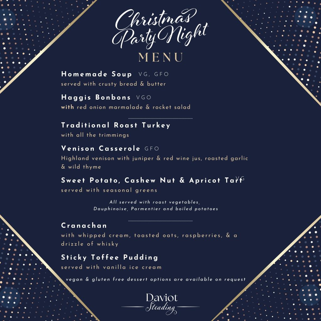 Join us at Daviot Steading on Saturday 20 December 2025 for a Christmas celebration packed with great food, fizz, and plenty of fun.